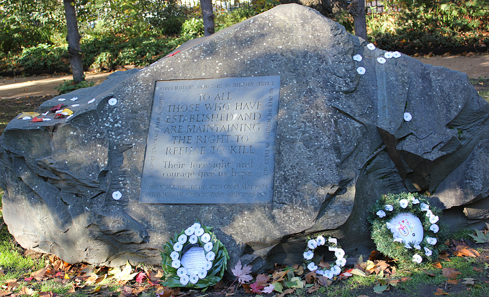 The erection of this massive slate stone to commemorate the struggle of conscientious objectors past and present was coordinated by the Peace Pledge Union and unveiled by the PPU's President, Michael Tippett in 1994 in Tavistock Square. It has become a focus for activities on International Conscientious Objectors Day each May. Architect: Hugh Court.