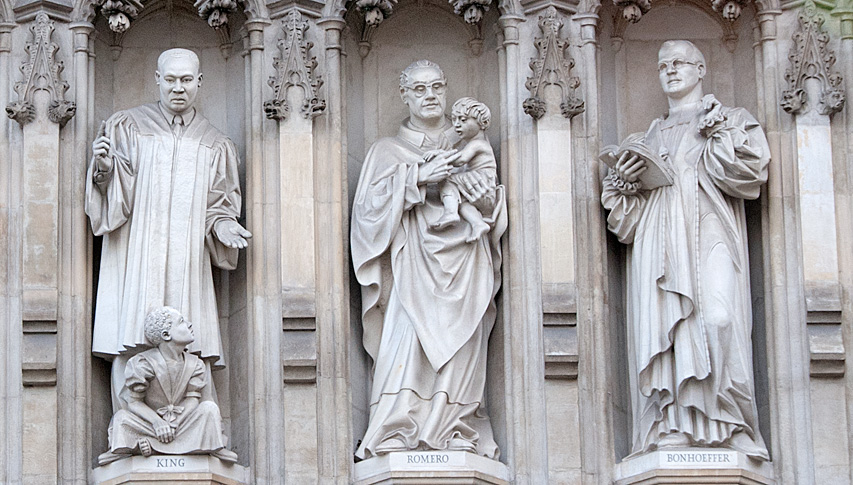 Amongst the statue is one of Martin Luther King placed in a prominent place above the central door. Next to King is a statue of Oscar Romero, and Dietrich Bonhoeffe.