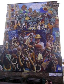 Peace Carnival Dalston Lane London E5 By Ray Walker completed after his death by his wife Anna and Nick Jones. 1983-85 Illustrates antiwar and pro peace activities. | more 1 2 3 | back