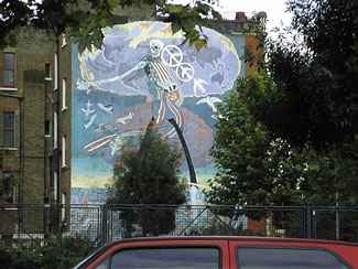 Nuclear Dawn Coldharbour Lane/Somerleyton Road London SW9. 50ft high, featuring skeletal figure of Death with cruise missiles against a sky filled with nuclear explosions._Brian Barnes, Dale McCrea and 15 volunteers from the Housing Association. 1983. | back |