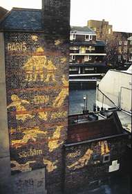 Photographs from Hiroshima show that people caught near the epicenter of the blast left only their 'shadows' - ghostly figures on the blackened floor or nearby wall, having themselves been vaporised. This inspired the International Shadow Project to recreate these images as silhouettes of figures in towns and cities around the world as a reminder of the consequences of nuclear war. The figures at Theatro Technic are sandblasted onto the wall. 'Peace' is written in English, Greek, Turkish, Irish, Chinese and Bengali - the principal languages spoken in the area. 'For people at the Theatro Technic a peace mural has more of an immediate significance than the threat of nuclear war. Since the coup in 1979 Cyprus has been divided into two hostile camps. One day we hope to see a united and peaceful Cyprus restored.'