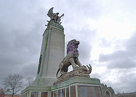 The memorial structure echoes and reinforces this hierarchy of thought. The names of the 1,512 dead are listed alphabetically on thirty-eight bronze panels. Above are two bronze lions representing the British Empire, one in combat with the serpent of evil, the other having triumphantly crushed it. |