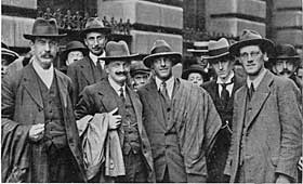 left to right: Walter H Ayles, J P F Fletcher, WJ Chamberlain, A Barratt Brown, Clifford Allen, Fenner Brockway