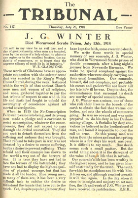 July 1918 By July 1918, Conscription had been extended to the limit, harassment of the NCF had died down to a constant background hum, and the war ground on for another month. Though from our vantage point the deadlock was soon to break on the western front, bringing an end to the war, to the writers of the Tribunal it was another month of the struggle. Issues of the Tribunal in July are filled with reprints and updates, painting a picture of an organisation (if not the whole country) ground down by the endless war. 4th July: The Time Limit
