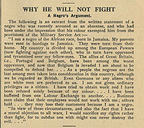 “My country is divided up among the European powers... who in turn have oppressed and tyrannised over my fellow men. The allies of Great Britain i.e. Portugal and Belgium have been among the worst defenders and now that Belgium is invaded I am about to be compelled to defend her.” Arguments from COs about the First World War being an Imperialist war are not uncommon, but it’s rare to hear this perspective. The defence “Plucky Little Belgium” was Britain’s excuse for entering the war, but the country, by 1916 torn between the British and German front lines, was the owner of the Belgian Congo and was widely regarded as the most brutal, oppressive and segregated colonial regime. Why should any man actively fight for the right of Belgium to keep it’s colony, let alone a Jamaican well aware of the racist policies of the Belgian Congo? “As a people the negroes are the last among men taken into consideration in this country, although we are regarded as British... I am not given ordinary privileges as a citizen... I have tried to obtain work and I have been refused solely because of my colour” Again, the question is clear - why should a man discriminated against, disbarred from working and faced with racism fight for the country which denied him the privileges other citizens enjoyed? Aside from presenting a very different view of why someone should be a Conscientious Objector, the statement poses a bit of a puzzle for CO researchers - who is this man? It could well be Isaac Hall, who was a Jamaican CO who we first find record of in Pentonville Prison in 1917 where he had been refused even the scant privileges other COs received and, in the words of Alfred Salter had been reduced to “a living skeleton-a gaunt, bent, starved, broken man, a coal-black man with ashen lips and sunken eyes”. But if Isaac is the man recorded here, he must have been sent to prison without Court Martial, without appearing before the Central Tribunal and without being made the offer of the Home Office Scheme, and remained in prison, illegally for several months. Isaac was eventually released and passage home was arranged through Alfred Salter and the NCF. But was it Isaac who made the statement in this issue of the Tribunal? His objection to war has been recorded as based on his strong Christian faith and a belief solely that Christians should and could not kill. The man making the argument here is anti-colonialist and imperialist and doesn’t mention religion. The issue is racism and oppression - could it be a different objector? Was another Jamaican CO caught up in the machinery of Conscription? 26th October - What a Soldier Thinks This article isn’t about conscientious objection but instead discusses propaganda - the image of the “smiling Tommy” that was used in both high and low propaganda in Britain throughout the war. A “veil of falsehood” has been drawn over the carnage of the western front that “flatters [non-soldier’s] appetite for novelty, excitement and easy admiration without uncomfortable emotional disturbance”. The core of the letter concerns the perception of war on the home front. That the war was “ennobling and that men find in war the fulness of self-expression impossible in Peace, and that they are more truly men than when they were at home”. A century on, these myths still assault us and the perception that war is somehow a positive force in the lives of those that fight it is still a persuasive one. Resonating even more with the modern day, the statement that “men who have spent a winter in the trenches regard war with hatred, and hoping dimly that by suffering it now, they will save the future from it” is one that The Tribunal would have jumped at the chance to print and, more than that, delivers a stinging rebuke to those today who encourage and allow wars to be fought. |